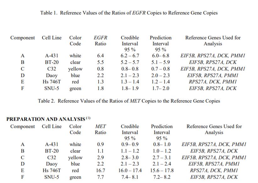 每個參考基因的 EGFR 和 MET 拷貝的參考比率與 95% 可信區間和 95% 預測區間顯示在表 1 和表 2 中。NIST 參考值是 NIST 證書上提供的真實值的最佳估計, NIST [3] 未對所有已知或可疑的偏倚來源進行全面調查的分析證書或調查報告。