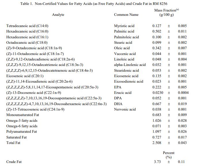 非認證值適用于方法開發、方法協調和過程控制,但不提供對國際單位制 (SI) 或其他更高階參考系統的計量可追溯性 [1]。計算非認證值,其中估計值是該分析物的測量平均值,標準不確定度通過傳統 A 類方法評估 [2]擴展不確定度是標準不確定度的倍數,以實現 95% 的覆蓋率。表 1 提供了粗脂肪和脂肪酸測量的未認證質量分數值和擴展不確定度,表 2 提供了粗蛋白的未認證質量分數值和擴展不確定度。