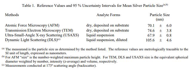 參考值是非認(rèn)證值,是對(duì)真實(shí)值的最佳估計(jì);然而,這些值不符合 NIST 的認(rèn)證標(biāo)準(zhǔn),并且提供了相關(guān)的不確定性,這些不確定性可能僅反映測(cè)量精度,可能不包括所有不確定性來源,或者可能反映多種分析方法之間缺乏足夠的統(tǒng)計(jì)一致性 [1]?;诜治鑫锏某叽缰翟诒?1 中報(bào)告列出的形式和方法。小瓶中銀的質(zhì)量見表 2。累積尺寸分布的值見表 3。本報(bào)告中提供了所用方法的概要(參見“參考值測(cè)量方法")。