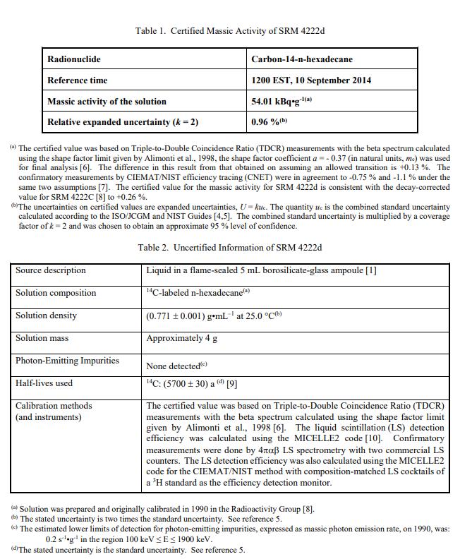 SRM 4222d 的一個單元由大約 5 mL 的溶液組成,其成分在表 1 和表 2 中規定,包含在火焰密封的硼硅酸鹽玻璃安瓿 [1] 中。在 2014 年 9 月 10 日美國東部標準時間 1200 的參考時間,經認證的碳 14 質量活動為:(54.01 ± 0.52) kBq?g-1