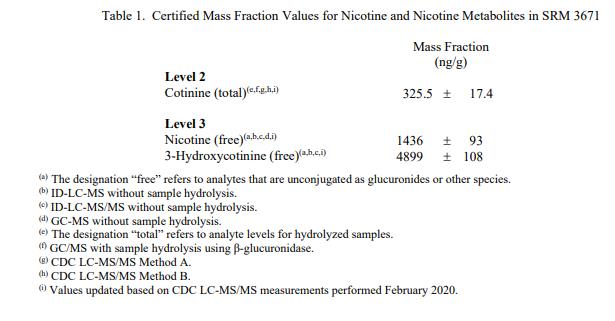 表 1 提供了尼古丁、可替寧和 3-羥基可替寧的認證值。NIST 認證值是 NIST 對其準確性有最高置信度的值,因為所有已知或可疑的偏差來源都已調查或考慮[1]。認證值基于 NIST 使用同位素稀釋液相色譜質譜 (ID-LC-MS) 測量的結果,同位素采用串聯質譜法 (ID-LC-MS/MS)、氣相色譜質譜法 (GC-MS) 的稀釋液相色譜法,以及在疾病控制和預防中心 (CDC) 使用 ID-LC-MS/MS 方法進行的測量.