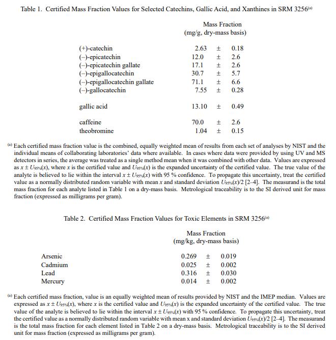 本材料中兒茶素和黃嘌.呤的認證值是各組結果的同等加權平均值;元素的認證值是 NIST 結果的平均值和合作實驗室結果的中位數的加權平均值。相關的不確定性是 95% 置信水平的擴展不確定性 [2-4]。