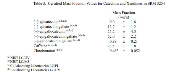 表 3 和表 4 提供了 SRM 3254 中兒茶素、黃嘌.呤和元素的認證質量分數值,以干質量為基礎報告。NIST 認證值是 NIST 具有最高置信度的值在其準確性方面,所有已知或可疑的偏差來源都已被調查或考慮 [3]。價值分配分析由 NIST 和合作實驗室進行。兒茶素和黃嘌.呤的認證值是各組結果的同等加權平均值;元素的認證值計算為 NIST 方法的平均值的平均值和合作實驗室提供的結果平均值的中位數(如果適用)。相關的不確定性以大約 95% 的置信水平表示 [4-6]。