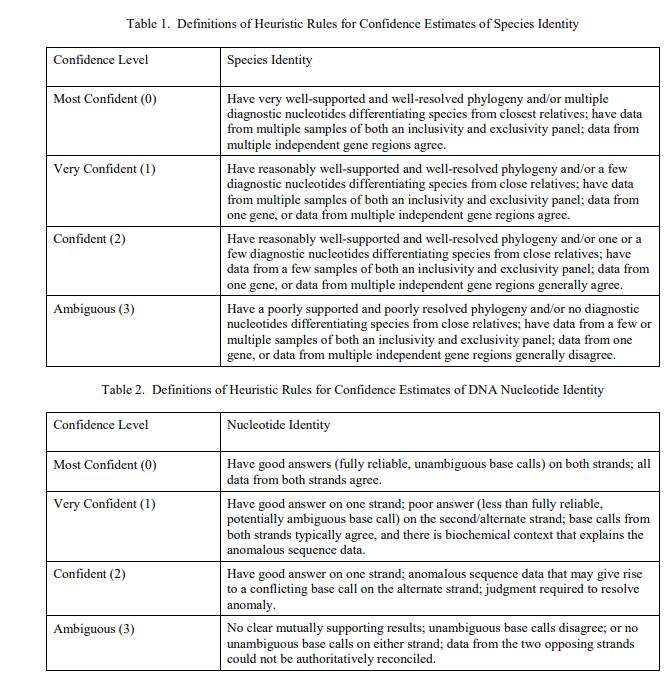 分類學特征是 Camellia sinensis,由經過培訓的植物學家使用來自原始材料的植物標本和來自植物學認證的 Camellia sinensis 的相關 DNA 序列分析確定。相關的 DNA 序列可在伴隨的 FASTA 格式文件中找到 [1]。與序列中每個核苷酸相關的不確定性,以及與作為物種標識符的 DNA 序列相關的不確定性,以表示規定值的置信度估計的序數標度表示(表 1 和表 2)[2] .這些 DNA 序列被用作 Camellia sinensis 的身份數據來源。
