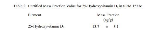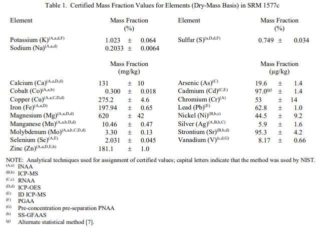 表1中提供了元素的認證質(zhì)量分數(shù)值。表2中提供了25-羥基維生素. D3的認證質(zhì)量分數(shù)值。元素的認證值基于所執(zhí)行的主要分析技術(shù)的結(jié)果在NIST或在NIST和合作專家實驗室獲得的兩種或多種化學獨立分析技術(shù)的組合結(jié)果[1]。25-羥基維生素.D3的認證值基于NIST和合作專家實驗室的綜合結(jié)果。NIST認證值是NIST對其準確性具有最高置信度的值,因為所有已知或可疑的偏差t源都已被調(diào)查或考慮在內(nèi)[1]。