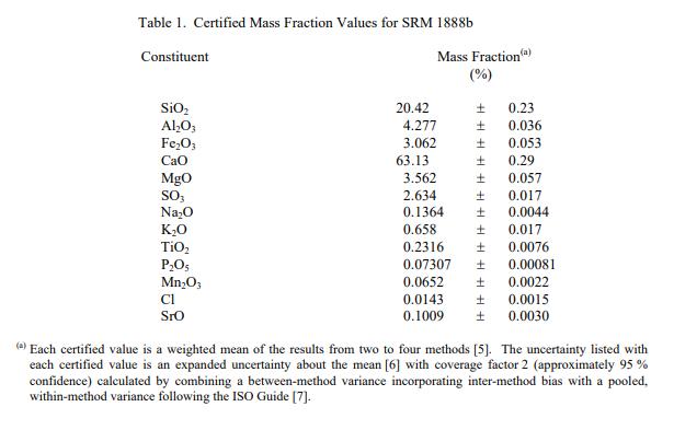 制備和分析1:SRM 1888b 的材料是采用典型工業工藝制備的粉末形式。該材料在 NIST 在 M.P. 的指導下混合并裝瓶。 NIST 測量服務部的 Cronise。在 NIST 使用 X 射線熒光光譜法 (XRF) 進行均勻性測試。對于大多數成分,材料異質性較低,適合價值分配的目的。 NIST 進行的定量測定包括 X 射線熒光光譜法 [4] 和熱重分析。合作實驗室采用的方法包括 X 射線熒光光譜法、電感耦合等離子體發射光譜法 (ICP-OES) 和 ASTM C 114-09 水硬水泥化學分析標準測試方法 [3] 中給出的參考方法。完整列表請參見附錄 A。