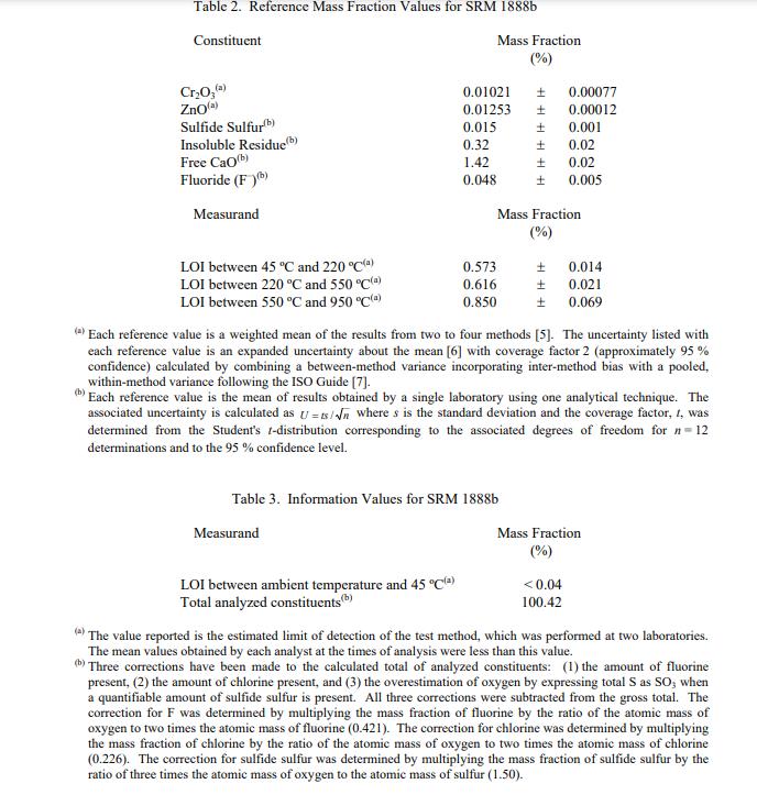 SRM 1888b 的 13 種成分的認證值在表 1 中報告為收到時的質量分數 [1]。 NIST 認證值是 NIST 對其準確性具有最高置信度的值,因為所有已知或可疑的偏差來源都已被調查或考慮在內 [2]。認證值是根據 NIST 和合作實驗室使用附錄 A 中列出的儀器和經典測試方法進行的分析結果對真實值的當前最佳估計。