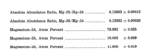 所提供的制備方法是一種高純度金屬鎂的工業(yè)樣品.測量采用三長絲(錸)質(zhì)量標(biāo)準(zhǔn),使用由高純度分離的鎂同位素制備的已知組分的混合物作為比較標(biāo)準(zhǔn)。總的誤差限制是基于95%的比率平均值的置信限,以及對可能的系統(tǒng)錯(cuò)誤的已知來源的允許。有關(guān)準(zhǔn)備和測量的細(xì)節(jié)由E.J.Catanzaro、T.J.Murphy、E.L.Garner和W.R.ShiShield出版,J.Re-Search NBS 70A,No.6,453-458(1966)。